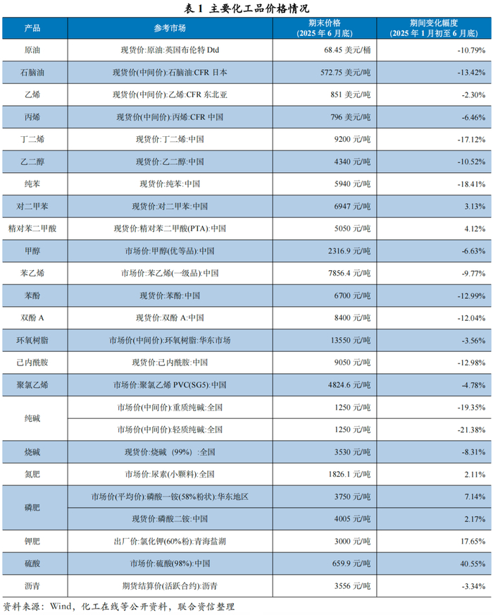 2025年1-6月,除化肥类产品价格有所上涨外,其他主要化工产品价格均有所下跌。具体来看,布伦特原油期间跌幅为10.79%,石油化工产业链上下游主要产品价格均呈下跌态势。
