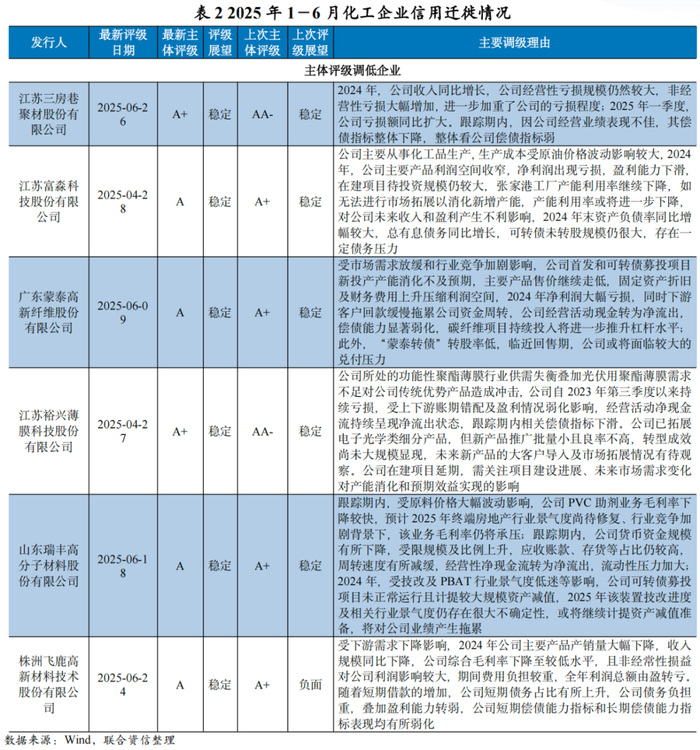 2025年1-6月,化工企业信用迁徙情况如下表所示(仅涉及公开可得数据),评级下调的主体为6家,评级下调因素主要涉及盈利能力下滑、公司经营活动现金流表现差、新增产能消化情况不及预期等多重因素。2025年1-6月,化工行业无新增违约主体。