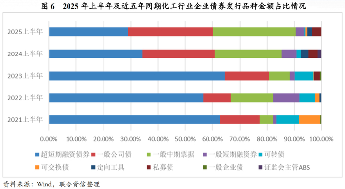 2025年上半年,在利率下行的背景下,化工企业发行债券规模同比增长,且期限向中长期倾斜。从发行品种来看,2025年1-6月,化工企业发行信用债券中,超短期融资债券发行37只,同比减少12只,但发行金额明显增长,为507.70亿元,同比增长136.22亿元;一般中期票据和一般公司债发行数量有所提升,分别为17只和40只,分别同比增长4只和8只,发行金额分别为545.00亿元和529.70亿元,占化工企业信用债券发行金额比例大幅提升。同期,转债供给规模明显低于往年同期,2025年1-6月,化工行业发行上市的转债仅1只,发行规模约为4.87亿元。