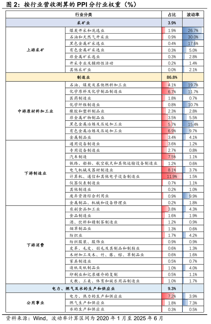 (2)PPI中下游波动并不一致。我们按照工业行业3大类41个子行业将PPI构成拆分,用最新行业营收数据作为权重,制造业占据最大比重(86.8%)。其中,中游原材料加工业占比31.7%,但2020年以来平均波动率达8.9%;下游制造业占比高达36.9%,但波动率仅2.3%。下游制造业在中上游价格传导过程中起到了缓冲器的作用,这也使得在当前终端需求复苏偏弱背景下,价格自上而下的传导出现中断。