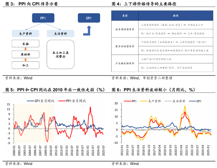 (3)PPI与CPI的趋势存在分化。逻辑上讲,PPI反映上游企业产品价格变化,CPI反映下游消费品价格变化。从成本角度看,上游价格波动会传导至下游,推动CPI上涨;从需求角度看,下游需求增加会拉动上游价格上升,带动PPI上涨。因此,正常情况下二者走势应保持一致。2000-2010年间,PPI与CPI走势基本一致,2010年后两者一致性走弱。目前反内卷相关政策主要为成本推动型传导,但在下游市场需求偏弱且供过于求时,消费者对价格敏感,上游涨价向下传导的路径明显受阻。