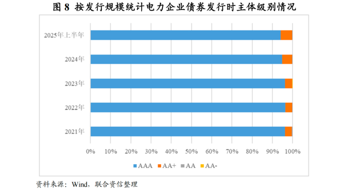 从主体发行级别分布看,2025年上半年,81家发债电力企业中,AAA级企业59家、AA+级企业19家、AA级企业3家,发债主体信用等级高。按发债规模统计,2021年以来AAA级企业发债金额合计值占比均在九成以上,但AA+级企业发债规模占比呈小幅增长态势,主要系近年来新增首次发债主体以清洁能源企业为主,信用等级多为AA+。从不同信用等级主体发债规模看,2025年上半年,AAA、AA+和AA主体发债规模占比分别为94.16%、5.62%和0.22%,高信用等级发债主体市场认可度相对较高且融资需求量大。