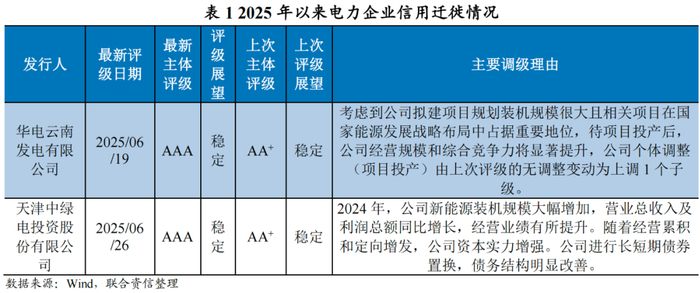 2025年以来,电力企业信用迁徙情况如下表所示(仅涉及公开可得数据)。同期,电力行业企业无债券违约情况。
