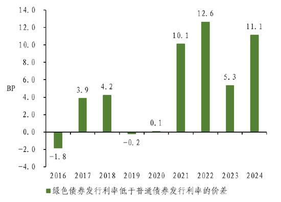 绿色债券市场发展初期,中国绿色债券发行成本优势尚不突出。以发行利率衡量,在2017年和2018年略具有融资成本优势,分别为3.9BP和4.2BP,其余年份绿色债券平均发行成本与普通债券接近。2021年中国人民银行《关于印发〈银行业金融机构绿色金融评价方案〉的通知》(银发〔2021〕142号)将业绩考核从绿色信贷拓展至绿色贷款和绿色债券,该政策出台后绿色债券的融资成本出现明显下降。2021年绿色债券发行成本优势逐渐凸显,较普通债券低10.1BP。2023年和2024年绿色债券继续维持较高的成本优势,分别为5.3BP和11.1BP。