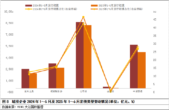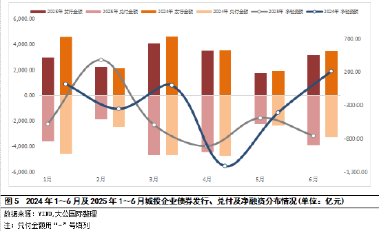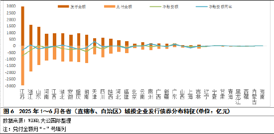 2025年1~6月,城投企业债券发行量及净融资规模同比均有所下降;城投债发行仍主要集聚在东部经济财政实力较强省份,江苏、浙江、山东发行规模较大;高级别城投主体仍是城投债发行的主力,新发债品种以公司债、中期票据及短期融资券为主,企业债发行规模大幅收缩;发债期限趋于中长期化。预计2025年下半年,在化债工作从过去的应急处置向现在的主动化解转变的背景下,城投债债务置换持续推进,城投债供给或将进一步缩减。