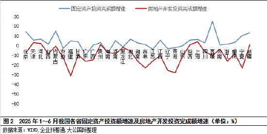 固定资产投资方面,2025年上半年,全国固定资产投资(不含农户)24.87万亿元,同比增长2.8%,其中分领域看,基础设施投资同比增长4.6%,制造业投资同比增长7.5%,房地产开发投资下降11.2%。从各省份看,2025年上半年,16个省份固定资产投资增速高于全国平均增速,其中西藏、内蒙古、北京、新疆及宁夏5个省份增速超过10%,在“两重”政策推动之下,全国固定资产投资增速或将进一步增长。但同时,8个省份的固定资产投资为负增长。房地产开发投资方面,2025年上半年,全国房地产开发投资4.67亿元,多数省份房地产开发投资完成额增速仍为负。值得关注的是,2025年上半年16个省份房地产开发投资完成额增速较2024年全年投资增速有所增长,在供需两端双向调节的政策下,房地产行业有望继续延续止跌回稳态势。