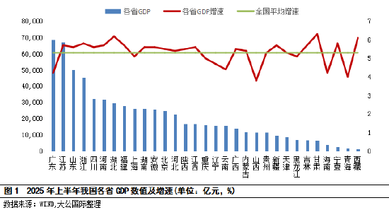 面对复杂的国内外经济环境,2025年上半年,我国经济运行总体平稳、稳中有进,主要经济指标增速处于合理区间,国民经济发展态势良好。经初步核算,2025年上半年,我国实现国内生产总值66.05万亿元,按不变价计算同比增长5.3%,初步达到全年国内生产总值增长5.0%的经济增长目标,其中第一产业增加值3.12万亿元,同比增长3.7%,第二产业增加值23.91万亿元,同比增长5.3%,第三产业增加值39.03万亿元,同比增长5.5%。分省份看(含自治区与直辖市,下同),全国31个省份中,广东省与江苏省GDP总量超6万亿元,20个省份GDP增速高于全国平均水平,24个省份增速高于全年经济增速目标。随着稳增长政策效应的不断显现,2025年上半年全国各地经济实力继续增强,GDP均保持正增长。