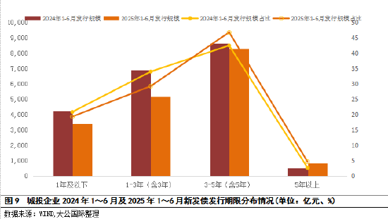 2025年上半年,在稳增长、一揽子化债政策陆续实施等背景下,城投企业发债数量及净融资规模同比均有所下降。同时,发债期限趋于中长期化,发债期限结构有所改善。预计2025年下半年,在化债工作从过去的应急处置向现在的主动化解转变以及城投加速转型的背景下,城投债债务置换持续推进,城投债供给或将进一步缩减。