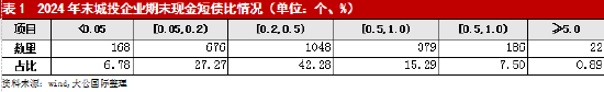 2024年,城投企业财务杠杆情况分化,利润总额仍然主要来自其他收益;城投企业经营性现金流状况有所改善,呈现净流出的城投企业数量占比同比有所下降,筹资性现金流呈现净流入城投企业数量占比同比有所下降,筹资活动现金流入承压;预计短期内,随着化债政策持续推进,城投企业经营性现金流状况或将得到进一步改善,但企业整体仍主要依靠再融资置换到期债务,且对于现金短债比很低的弱资质城投企业,需关注现金短债比很低的弱资质城投企业流动性压力情况。