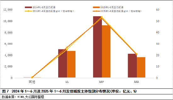 从发债城投企业主体信用评级分布来看,2025年1~6月,各主体信用级别的发债主体发行规模均同比有所下降,其中AA+及AAA主体发行规模同比下降较多,分别下降1,608.81亿元和615.57亿元。从分布上来看,城投债发行仍然集中在AA+城投企业,AA+主体发行规模占总发行规模的比重为52.39%,较2024年同期略有下降,但仍保持在较高水平。整体来看,2025年上半年,高级别城投主体仍是城投债发行的主力,但发行债券规模缩量仍较为明显。