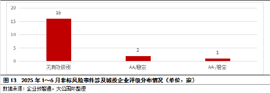 从区域分布来看,城投非标风险事件主要集中在地方经济财政实力偏弱、债务压力偏高或债务管控能力不强的区域,需加强对区域融资环境的关注。2025年上半年,非标风险事件主要集中在山东省(8例)、云南省(5例)、贵州省(4例)、陕西省(2例)、四川省(1例)、河南省(1例)。2025年上半年,山东省城投非标融资风险事件均涉及在潍坊市6例和青岛市2例;贵州省2025年上半年分别涉及遵义市、黔南布依族苗族自治州独山县、盘州市、安顺市各1例;云南省2025年上半年发生非标风险事件5例,其中昆明市和红河哈尼族彝族自治州分别均涉及2例,楚雄彝族自治州涉及1例。从级别分布来看,2025年一季度,非标风险事件涉及的融资主体共19家,信用等级分布为无有效级别16家,AA评级2家,AA-评级1家。整体来看,2025年上半年,发生非标风险事件的主体以无有效评级和低评级为主,需关注尾部城投的非标风险。