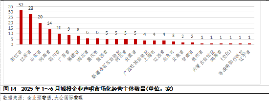 自2023年10月以来,陆续有城投企业在募集说明书中声明“本企业为市场化经营主体”,其目的更侧重于通过债券的发行审核。根据企业预警通公开数据统计,2025年1~6月,全国有178家城投企业声明为市场化经营主体,数量同比下降17家。从城投企业所属省份来看,声明市场化经营主体主要集中于浙江省,涉及城投企业32家,其余主体主要分布为江苏省28家、山东省20家、河南省14家、四川省10家、广东省9家等;声明描述包括:企业为市场化经营主体,地方政府不对企业的债务承担责任;企业已剥离政府融资功能;主营业务市场化运作,不承担地方政府融资职能;企业不涉及地方隐性债务、企业为自主经营、自担风险的市场化经营主体等。