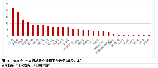 35号文的发布以及“331名单”、“3899名单”等的统计掀起了“退平台”的热潮,“退平台”是指名单内城投企业通过公告宣布退出政府融资平台名单或不再承担政府融资职能,一方面落实压降融资平台数量的政策要求,另一方面避免名单内企业融资受限。根据企业预警通公开数据统计,2025年1~6月,城投企业退平台数量为174家,数量同比下降71家。从城投企业所属省份来看,退平台城投主体主要集中于山东省,涉及城投企业22家,其余主体主要分布于青海省19家,江苏省13家,云南省11家,重庆市9家、河南省9家、浙江省9家等。城投企业退出平台原因主要包括隐性债务已清零、不属于政府融资平台或已退出政府融资平台,不承担政府融资职能、融资平台整合、公司主营业务主要包含产业投资、民生事业,是市场化运营的产业类企业等、主营业务无土地开发和代建等城投类业务等。