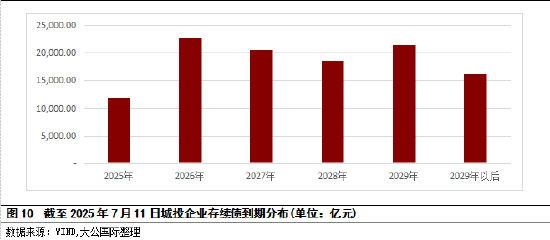 截至2025年7月11日,根据WIND行业分类,城投债余额合计111,532.05亿元,其中2025年末前到期的城投债券金额合计11,820.53亿元,占存量城投债的比重10.60%;存续城投债集中在2025年到2027年到期,合计占存量城投债的比重为49.36%,其中2026年到期城投债占存量城投债的比重为20.33%。