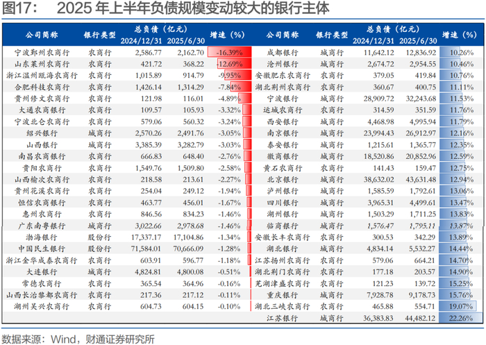 与资产规模变动基本一致,今年上半年91.51%的银行实现负债规模的增长,其中江苏银行、湖北三峡农商行、重庆银行、芜湖津盛农商行增速都在15%以上。