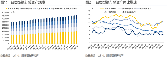 2025年上半年银行业整体经营状况稳步发展,国有行和城商行扩张最为明显,资产规模同比增速分别达到10.99%和10.96%。一季度不良资产余额明显增长,二季度有所改善,其中大行和农商行不良贷款率下降,民营银行不良率上行。各类银行净息差继续承压,城商行尤其明显。