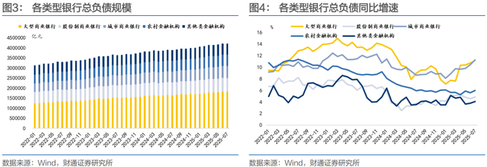 ②负债端:走势基本与规模扩张一致。伴随着大行和城商行资产规模的扩张,负债端亦上行明显,增速分别为11.18%和11.24%,其余类型银行负债增速总体位于4-6%之间。