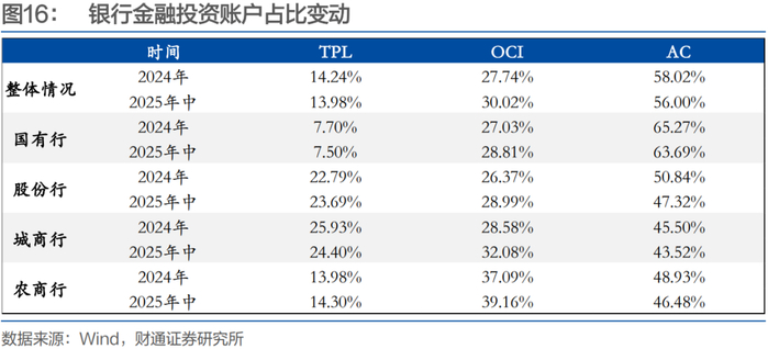 ①绝大多数银行实现规模正增长,少量中小行缩表,增长部分中30%以上来自于金融投资规模的扩大,农商行资产结构中金融投资占比增长0.71pct。上半年部分银行处置AC账户来兑现浮盈,尤其是股份行和农商行表现更为明显,另一方面,OCI账户比重提升。