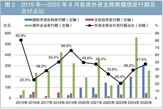 二是市场基础性制度的完善和持续优化,大幅提升了熊猫债融资的便利性。2022年以来,监管部门从市场准入、信息披露、会计准则、资金使用等方面进一步优化熊猫债市场基础性制度。尤其是中国人民银行、国家外汇局于2023年1月起实施的《关于境外机构境内发行债券资金管理有关事宜的通知》(银发〔2022〕272号),统一了银行间市场和交易所市场关于熊猫债发行所涉及的资金登记、账户开立、资金汇兑及使用、统计监测、外汇风险管理等规则,明确境外机构境内发行债券募集资金既可汇往境外,也可留存境内使用,并允许境外发行机构开展外汇套期保值交易等。2025年7月,国家发展改革委等七部门共同印发的《关于实施鼓励外商投资企业境内再投资若干措施的通知》(发改外资〔2025〕928号)中明确为符合条件的外商投资企业境内再投资所需熊猫债开辟“绿色通道”,优化管理流程。这些举措在前期政策优化的基础上进一步提升了监管政策的透明度和熊猫债募资及使用的便利度,不仅提高了熊猫债市场的吸引力,也进一步强化了境外机构对熊猫债市场稳步发展的信心。