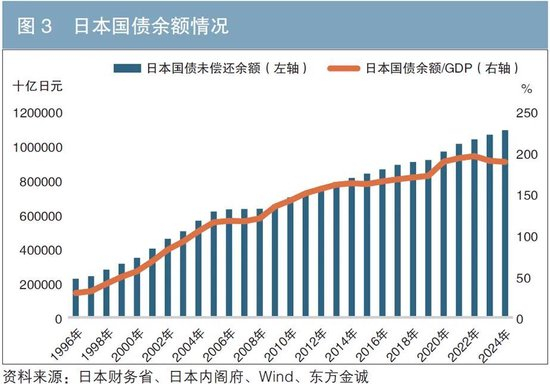 20世纪90年代以来,为应对经济下行,日本政府启动赤字财政政策,增加公共投资并实行降税,但未带动日本实现可持续的经济复苏。在此背景下,日本税收长期增长乏力,财政支出则被动扩大,政府陷入赤字困境,只能依靠发行国债来弥补收支缺口,债务负担日渐沉重。截至2024年末,日本国债余额增至1173.6万亿日元,国债余额/国内生产总值(GDP)达到192.6%,国债依存度为33.3%,均远超国际警戒线(见图3)。