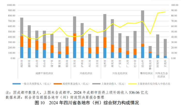 四川省各地市(州)上级补助收入对综合财力的贡献度较高。从上级补助收入规模来看,凉山州、成都市、南充市和达州市获得上级补助收入规模均超400亿元,主要为扶贫补助和对水电、农业等的补贴等。除成都市、德阳市和眉山市以外,四川省其余地市(州)上级补助收入在综合财政收入中占比均超过40%,其中川西北生态区的阿坝州和甘孜州均超过85%。
