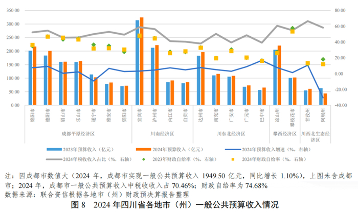 四川省各地市(州)经济发展不均衡,成都市经济实力远强于其他地市(州),人口虹吸效应明显。2024年,大部分地市(州)一般公共预算收入呈增长趋势,税收占比和财政自给率水平较低;政府性基金收入整体呈下降趋势,上级补助收入对综合财力的贡献度较高。