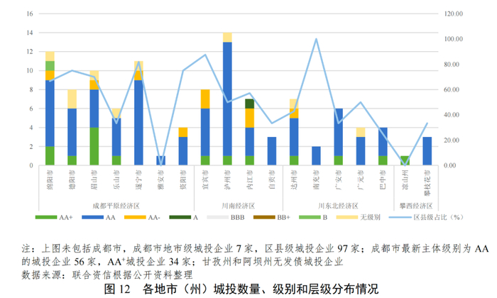 四川省城投企业行政层级较为下沉,其中成都市各区县发债城投企业数量占比近一半;发债城投企业主体信用级别以AA为主,高信用级别城投企业主要集中在成都市。