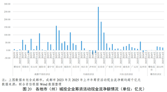 短期偿债能力方面,2024年末,四川省各地市(州)发债城投企业现金短期债务比均小于1,大部分地市(州)呈现不同程度的下降。2025年6月末,各地市(州)发债城投企业现金短期债务比略有上升,遂宁市相对较低,存在较大的短期偿债压力。再融资方面,2024年及2025年上半年,泸州市和达州市持续净流出,其他地市(州)发债城投企业筹资活动现金流整体为净流入;筹资活动现金流入中取得借款收到的现金占比较高。2024年各地市(州)净流入规模整体较上年有所下降,德阳市、乐山市、内江市下降明显。其中,成都市发债城投企业筹资活动现金流入量超万亿,川东北经济区和攀西经济区发债城投企业数量不多,筹资活动现金流入和净流入规模相对较小。