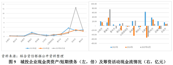 短期偿债能力方面,2024年底,晋城、晋中、长治、朔州和忻州发债城投企业货币资金对短期债务的覆盖倍数大于1倍,太原、临汾、运城和大同发债城投企业货币资金对短期债务的覆盖倍数小于0.3倍;除山西综改区和忻州市外,山西省其余各地市发债城投企业的覆盖倍数均有所下降。2025年6月底,大同市、运城市和临汾市城投企业的现金类资产对短期债务的覆盖倍数均低于0.3倍,存在较大的短期偿债压力;忻州市城投企业优化债务结构,加上现金储备充足,现金类资产对短期债务的覆盖倍数明显提升。再融资方面,2025年上半年,晋城市城投企业债券净融资规模较大,晋城市国有资本投资运营有限公司发行债券合计13亿元,用于补充山西兰花煤炭实业集团有限公司流动资金、偿还公司有息债务,晋城市城投企业筹资活动现金流持续净流入;太原市、运城市和晋中市债券净偿还规模较大,筹资活动现金流呈较大规模净流出。