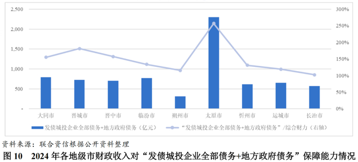 受限于自身经济财政实力,山西省多数地级市发债城投企业数量较少、发债城投企业规模较小,城投企业债务在区域整体债务中占比不高。除太原市外,其他地市“发债城投企业全部债务+地方政府债务”/综合财力均低于200%。
