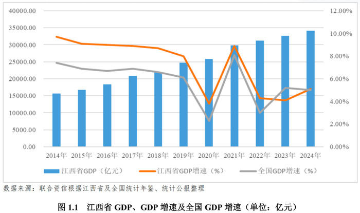 江西省经济总量居全国中游,人均GDP处于中下游水平。2024年,江西省完成地区生产总值34202.5亿元,在全国各省市自治区排第15名;GDP增速为5.1%,略高于全国平均水平;固定资产投资同比增长4.8%,主要得益于基础设施投资及高技术产业投资等重点领域发力,叠加特别国债、专项债等政策带动。2024年,江西人均GDP为7.59万元,在全国排第19名(较2023年提升2位),处于中下游水平。2025年1-6月,江西完成地区生产总值16719.6亿元,同比增长5.6%,经济保持发展。