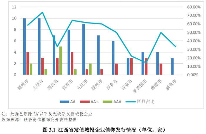 江西省发债城投企业以地市级和区县级为主,其中赣州市发债城投企业数量最多。江西省发债城投企业主体信用级别以AA为主,高信用级别城投企业主要集中在南昌市和赣州市。