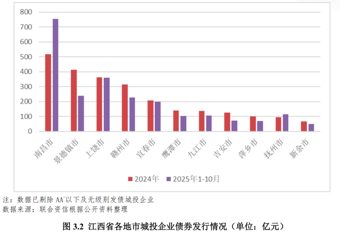 2024年,江西省整体债券发行规模同比有所增长;净融资规模较上年大幅下降,其中南昌市、景德镇市、萍乡市和宜春市保持债券融资净流入,其余地市债券融资均为净流出。2025年1-10月,景德镇市和抚州市城投企业债券净融资净流入,其余地市城投企业债券净融资均为净流出;受存续债券集中到期叠加债券提前兑付、回售规模相对较大等因素影响,上饶市和南昌市城投企业债券融资呈现较大规模净流出。