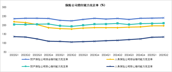 行业偿付能力充裕,综合、核心偿付能力充足率远高于监管要求。人身保险公司整体偿付能力压力高于财产保险公司,2025年二季度末人身保险公司整体综合偿付能力充足率和核心偿付能力充足率分别为196.6%和134.3%,分别低于财产保险公司44和76.9个百分点。同期末,发债人身保险公司综合、核心偿付能力充足率中位数分别为211.57%和140.95%;发债财产保险公司综合、核心偿付能力充足率中位数分别为232.6%和164.61%。