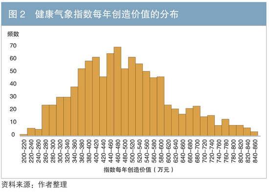 针对年人均疾病发生次数、不同严重程度的概率及单次医疗费用3类关键参数的不确定性,本文采用蒙特卡洛模拟,在其取值范围内进行1000次随机抽样,生成健康气象指数创造价值的概率分布(见图2)。模拟结果显示,指数年均价值为476万元,中位数为463万元,分布呈现右偏趋势。当3类参数同时取低值时,价值集中于左侧分布;反之,取高值时价值显著右移。分布图表明,疾病发生频率、严重程度分布与医疗费用对指数价值具有显著的叠加效应。