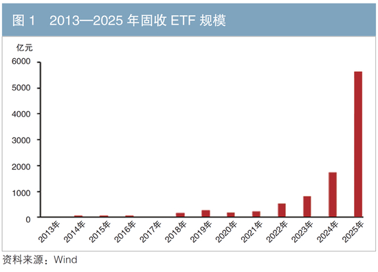 2013年,我国全市场首只债券ETF—国泰上证5年期国债ETF成立。2019年,《关于做好开放式债券指数证券投资基金创新试点工作的通知》发布,拟推出以跨市场债券品种为投资标的、可在交易所上市交易或在银行间市场协议转让的债券指数公募基金。2022年,首批跨市场政金债ETF发行,打通了银行间债券市场和交易所债券市场。随后3年,债券ETF市场规模呈现逐年跃迁趋势(见图1)。根据万得(Wind)数据,2022年债券ETF市场规模首次突破500亿元,较上年增长超一倍;2023年达802亿元;2024年扩大至1740亿元。截至2025年8月末,存续债券ETF规模合计为5643.12亿元,2021年至今复合年均增速达137.04%。