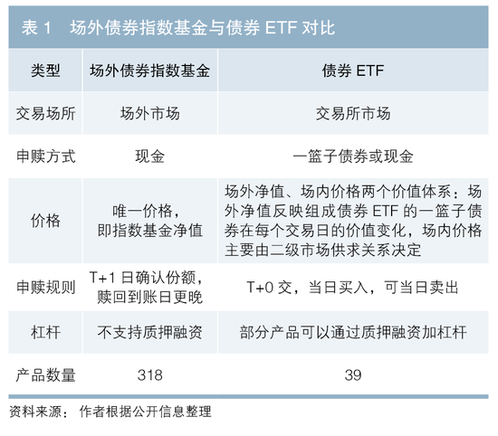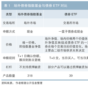 债券ETF属于被动指数型债券基金,区别于场外债券指数基金(详见表1),在交易所上市交易,投资组合由一篮子债券组成。购买债券型ETF的份额相当于购买基金中的一篮子债券,债券ETF可通过一篮子债券或现金进行申赎,且实行T+0交易制度。