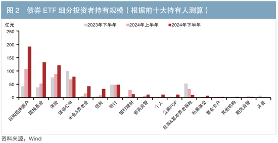 截至2024年末,债券型ETF的机构持有规模比例为85%。根据前十大持有人数据,回购质押账户、联接基金、保险对于债券ETF规模上涨贡献较大,年金与养老金等资金持有规模亦有所提升(见图2)。利率债类ETF及信用债类ETF相继纳入回购质押库后,机构投资者配置债券ETF的偏好明显提升。2024年年报披露的前十大持有人中,回购质押专用账户的持有规模合计为192亿元,在前十大持有人中占比27%。基准做市债和科创债ETF还未披露半年报和年报,从上市公告书披露的情况看,证券公司、银行、信托等机构参与首发较多。