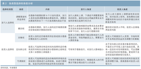 债券发行条款可分为选择权类型的发行条款和非选择权类型的发行条款,本文从创新灵活性角度仅讨论选择权类型的发行条款。选择权类型的发行条款包括发行人选择权和投资人选择权,发行人选择权主要包括调整票面利率选择权、赎回权、利息递延权和延期兑付权,投资人选择权主要包括回售权、定向转让权和可调换权(见表2)。