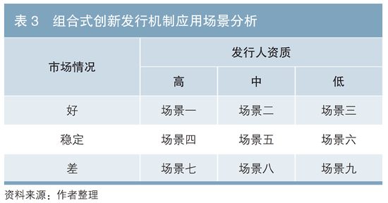 根据上述发行条款和簿记建档的创新机制,可从发行人资质和市场情况两个维度设计不同的应用场景,并针对不同的应用场景选择合适的组合式发行机制(见表3)。
