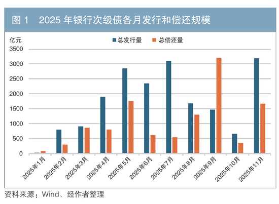 与2024年情况基本一致,2025年银行次级债供给高峰集中在二季度(见图1)。从近期来看,尽管2025年9月银行次级债到期量较大,但受9月市场回调、发行成本趋高及利息收入增值税政策调整影响,部分发行需求被后移至11月。从具体的月度分布来看,5月、7月及11月的单月供给均超过2800亿元。结合全年银行次级债利率走势来看,5 月、7 月及 11 月同为市场阶段性低点,利率处于下行通道且波动收敛。这一环境有利于银行发行人顺利完成次级债发行。