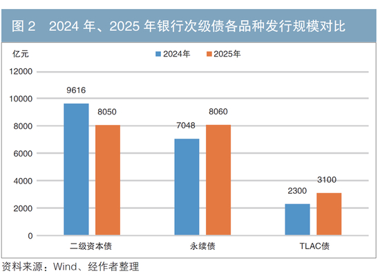 2025年初至11月末,二级资本债发行8050亿元,同比下降1565亿元,发行占比由去年的51%回落至42%;永续债发行8060亿元,同比增加1013亿元,发行占比升至42%;TLAC债发行3100亿元,同比增加800亿元(见图2),发行占比升至16%。
