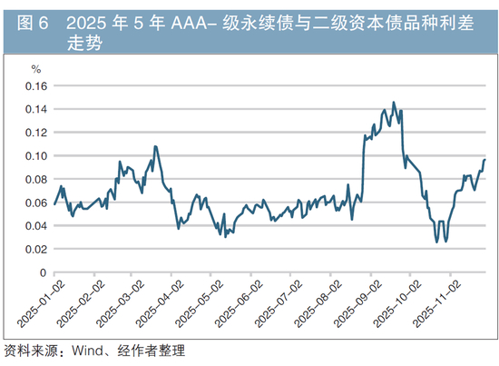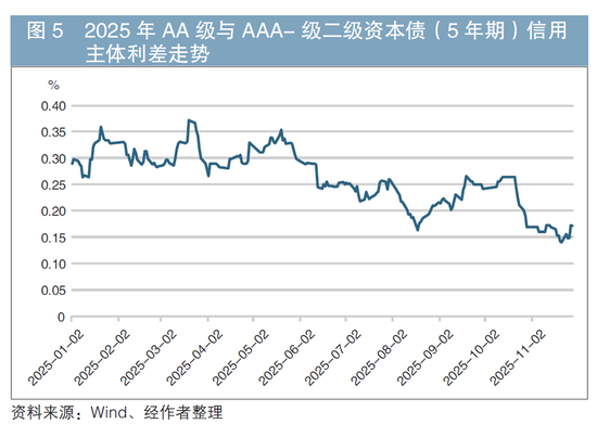 以5年期二级资本债AA级与AAA-级间信用主体利差为例,2025年一季度债市回调时,该利差上行近15BP至35BP附近,这也是2024年以来该利差的高点。2025年下半年,虽然银行次级债收益率再次调整,但较低等级的银行次级债品种表现较为强势,该利差并未跟随债市收益率上行,反而收窄至11月末的19BP附近(见图5)。这主要体现在债市偏弱的背景下,各投资机构加大了对票息资产的追逐力度。