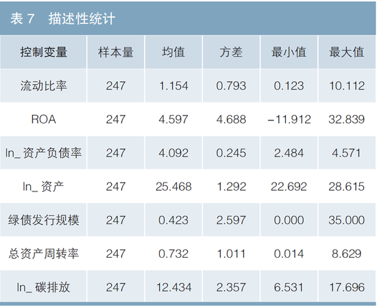 本文以公司为单位,匹配历年公司绿债发行规模与当期碳排放量等数据,在剔除缺失值和异常值之后,共得到247条样本数据。数据来源于Wind和国泰君安数据库,描述性统计如表7所示。