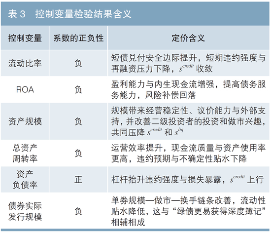 从控制变量定价检验结果来看,显示出的是“信用风险—流动性—效率”的一致性。具体含义如表3所示。