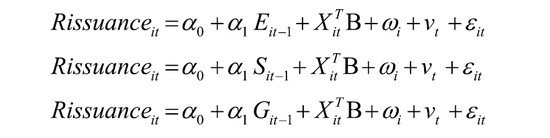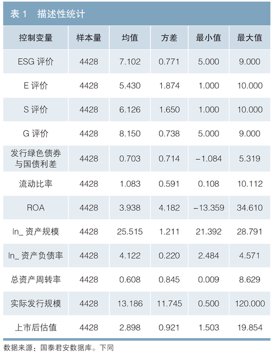 其中Rissuanceit为被解释变量,采用企业发行的绿色债券与同期限国债发行日当天的利差进行衡量。ESGit-1为解释变量,采用企业ESG得分进行衡量。为了观察E、S、G分项得分对绿色债券发行溢价的影响,分别选取企业E、S、G得分作为解释变量进行回归,设定模型为如下三种形式进行回归。