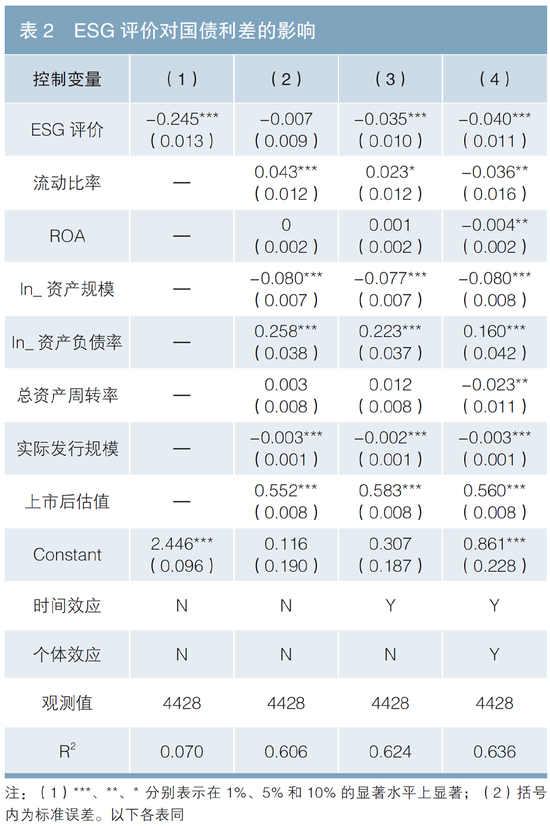 总体来看,在固定效应模型中,ESG得分显著为负,说明结论稳健。在双向固定效应模型中,ESG评价估计系数为-0.04,说明ESG得分每上升1分,发行绿色债券与国债之间利差可以缩窄4个BP。