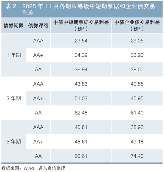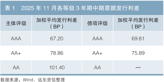 以2025年11月的3年期中期票据利差为例,债券的平均发行利差和平均交易利差均呈现出信用等级越高则利差越小的规律(见表1、表2),清晰反映出不同信用等级对应的风险溢价水平。信用评级的辅助定价功能帮助发行人在市场融资中获得与自身信用水平相匹配的公平定价,从而为市场各类投资者资产配置、交易和风险管理提供参考,也为监管部门管理和控制风险提供有效信息。