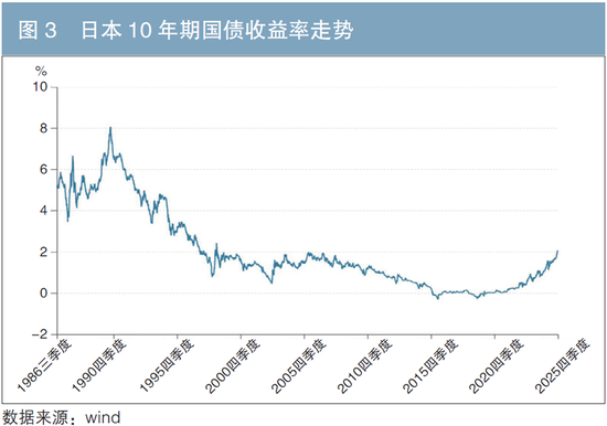 过去30年,日本经济接连遭受多重危机冲击(如20世纪90年代初泡沫破裂、1997年亚洲金融危机、2008年国际金融危机、2020年新冠疫情等),经济增长长期疲软,通胀持续低迷甚至陷入通缩,企业投资与居民消费意愿低迷,市场对安全资产(如国债)的需求旺盛。为缓解债务压力,日本政府倾向于维持低利率以降低政府融资成本,并通过长期维持超低利率状态以刺激经济复苏。这些因素的共同作用,推动10年期国债收益率从1990年泡沫破裂前的8%持续下行,最低降至0附近(见图3)。