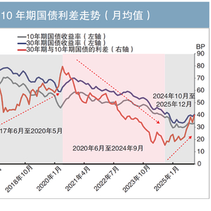 2020—2024年,伴随着债券市场牛市行情持续,30年期与10年期国债利差持续震荡下行,从2020年5月约83个基点(BP)的高点一度压缩至2024年9月24日1前的10BP。2025年以来,债券牛市行情有所放缓,30年期与10年期国债利差逐渐抬升,年末一度回升至40BP的阶段性高位。30年期与10年期国债利差走势会受哪些因素影响?2025年末的期限利差已回升至2023年初的位置,后续是否还有进一步抬升的空间?本文通过回顾债券市场走势,揭示可能影响30年期与10年期国债利差走势的因素,并对未来的利差走势作出预测。